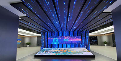 晟跡以多媒體科技助力筑夢小鎮,以互動感應門、墻面互動、投影沙盤等多媒體展項打造未來感十足的展廳。