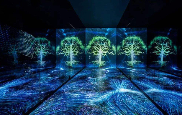 沉浸式光影互動投影是基于多通道視覺同步技術和立體顯示技術的視覺協同環境。系統提供房間大小的四面(或六面)立方體投影顯示空間,所有參與者完全沉浸在由立體投影圖像包圍的環境中,并且將揚聲器系統和運動采集系統結合以獲得沉浸式交互體驗。